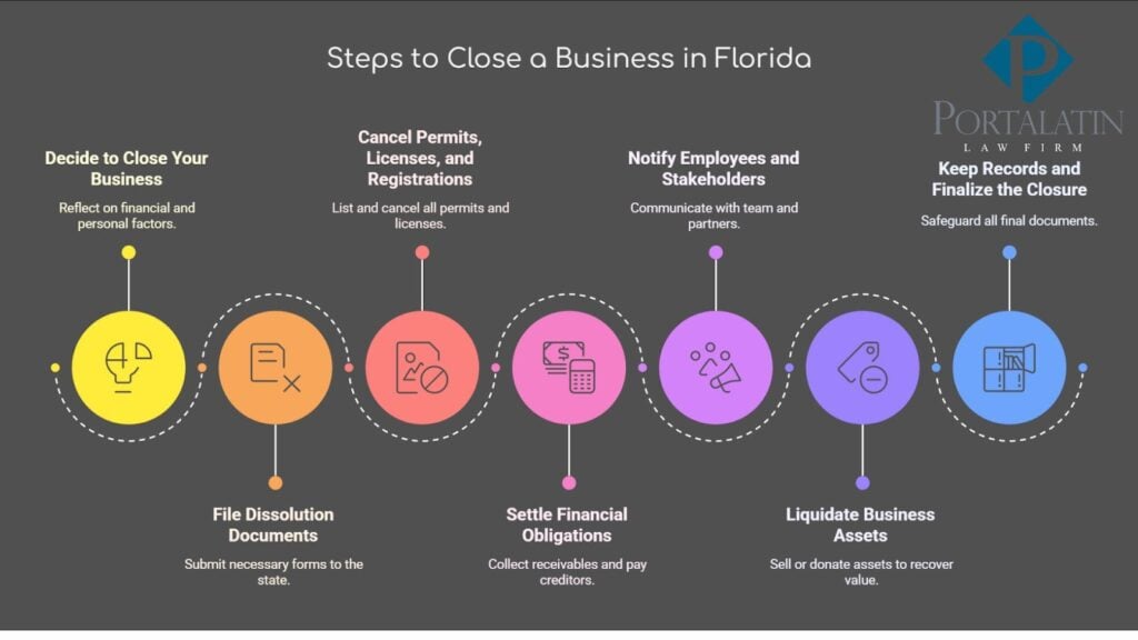 - Es importante liquidar activos, conservar registros y comprender las regulaciones específicas de Florida durante este proceso.